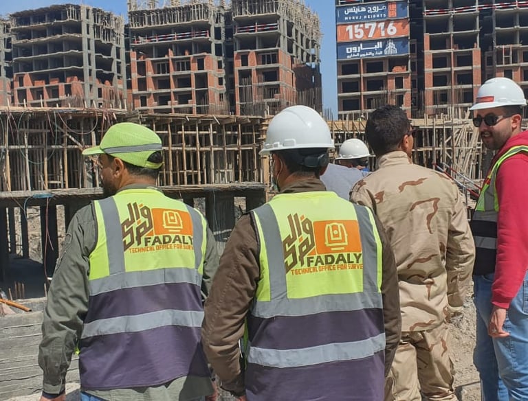 من اعمال الرفع المساحي الطوبوغرافي للموقع ورفع الميزانيات الشبكيه وعمل الثوابت المساحية وتسليمها للشركة ليتم استخدامها في تصميم المعماري والانشائي للموقع ومن ثم التنفيذ من الثوابت المساحية